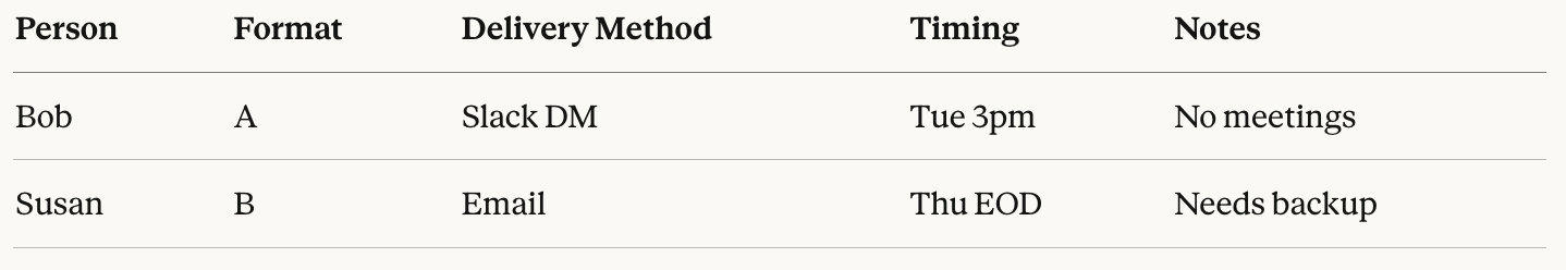 “Bob and Susan, you are both asking for the same information but in formats that are specific to your preferences. I will post all the information you need here in this format. That way you can adapt it as needed.”
